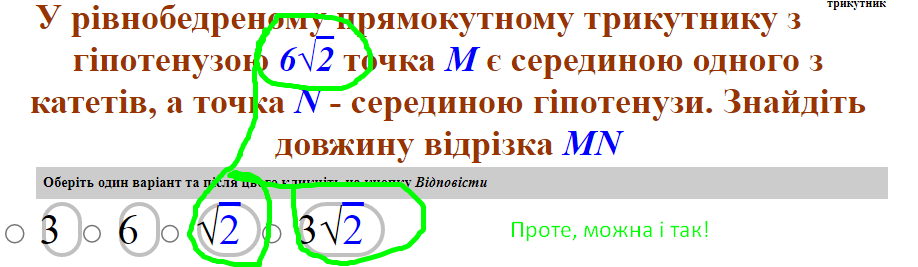 На малюнку праворуч наведено скрін з іншого навчального сайту і відмічено фрагменти вирішення цієї проблеми. А саме фрагменти з показом математичних виразів з використанням радікалу.